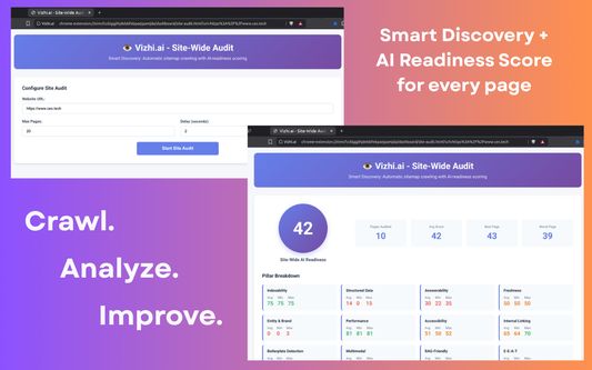 Vizhi.ai is a 100% local browser extension that audits any webpage and tells you how ready it is for the AI era. In just one click, you’ll get a complete AI Readiness Score (0-100), backed by evidence, fixes, and insights across 12 powerful pillars.